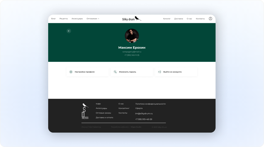 Профиль клиента включает в себя персональные данные пользователя и кнопки управления: настройки, изменение пароля и выход из аккаунта.