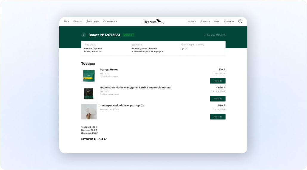 Страница с детальной информацией по заказу. Клиент видит все данные, что вводил при оформлении заказа в корзине: контактные данные, способ и адрес доставки, комментарий, состав и детализацию стоимости.