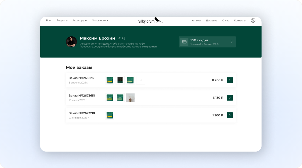 Раздел показывает последние оформленные заказы. Каждая карточка включает в себя номер и дату заказа, фото товаров, стоимость и кнопку для перехода на страницу заказа.