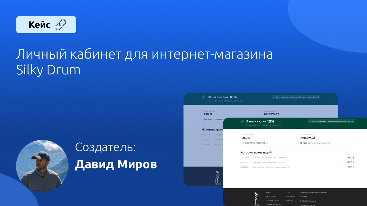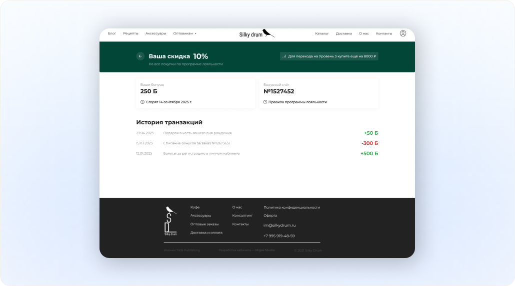 Программа лояльности включает 4 уровня, на каждом из которых клиент получает персональную скидку: 0, 10, 15 или 20%. Помимо персональной скидки, клиент может получить бонусы за разные события: регистрация, день рождение и др. Бонусы сгорают автоматически через 180 дней без новых заказов.